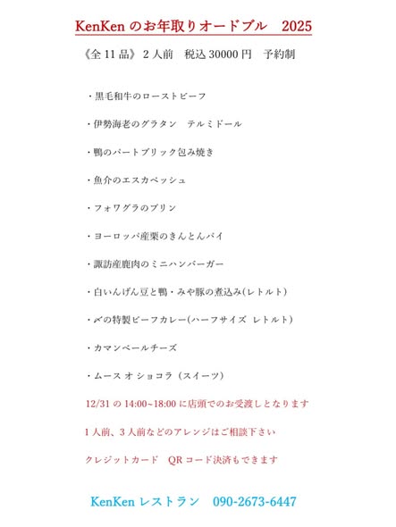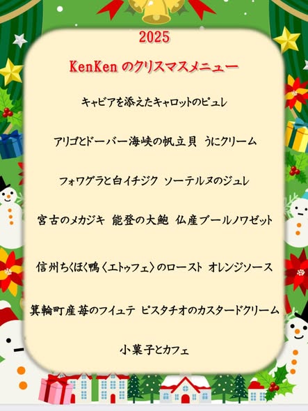 ケンケンレストランではクリスマス特別ディナー•テイクアウト商品•お年取りオードブルをご用意いたします。大切な方と美味しい料理で楽しみましょう😋